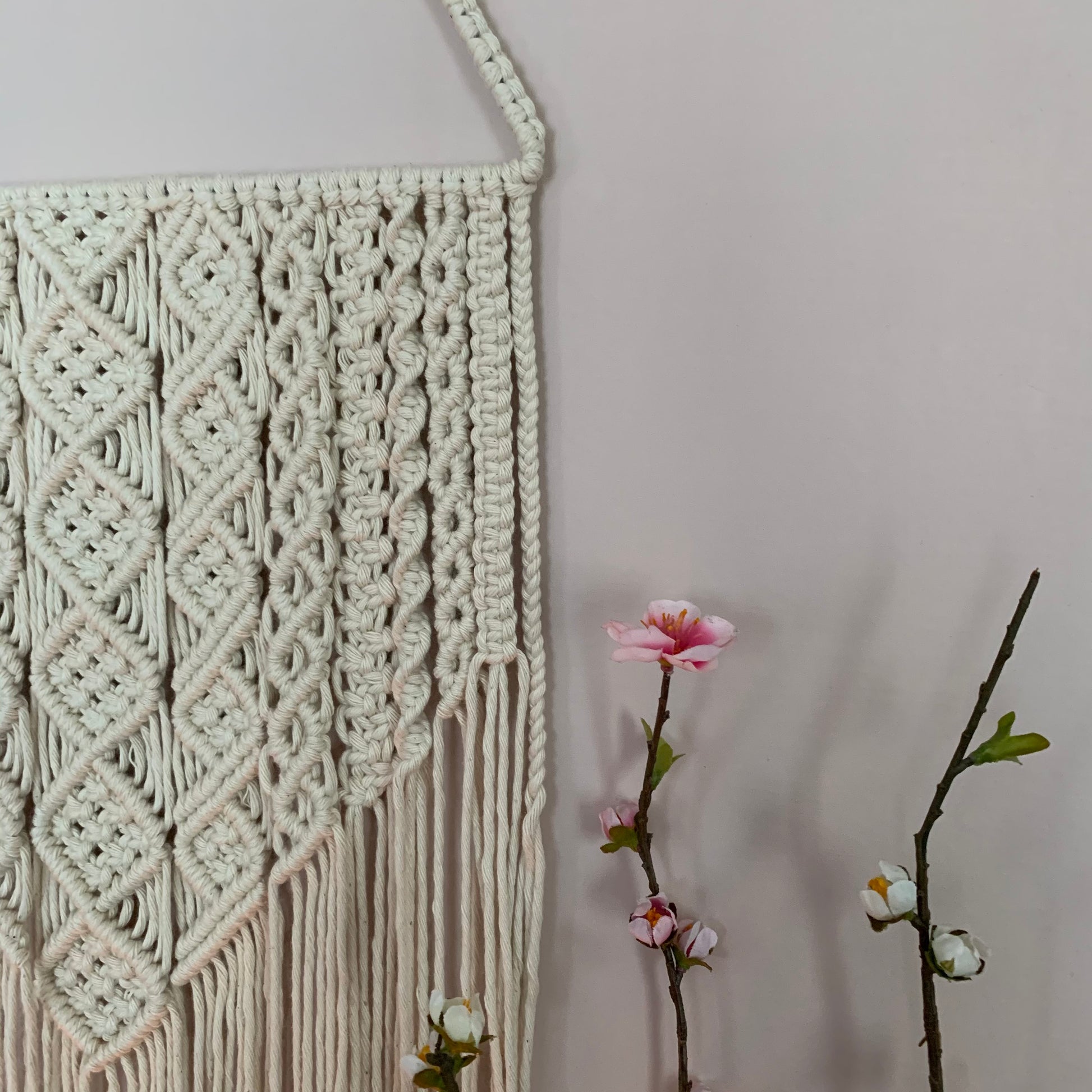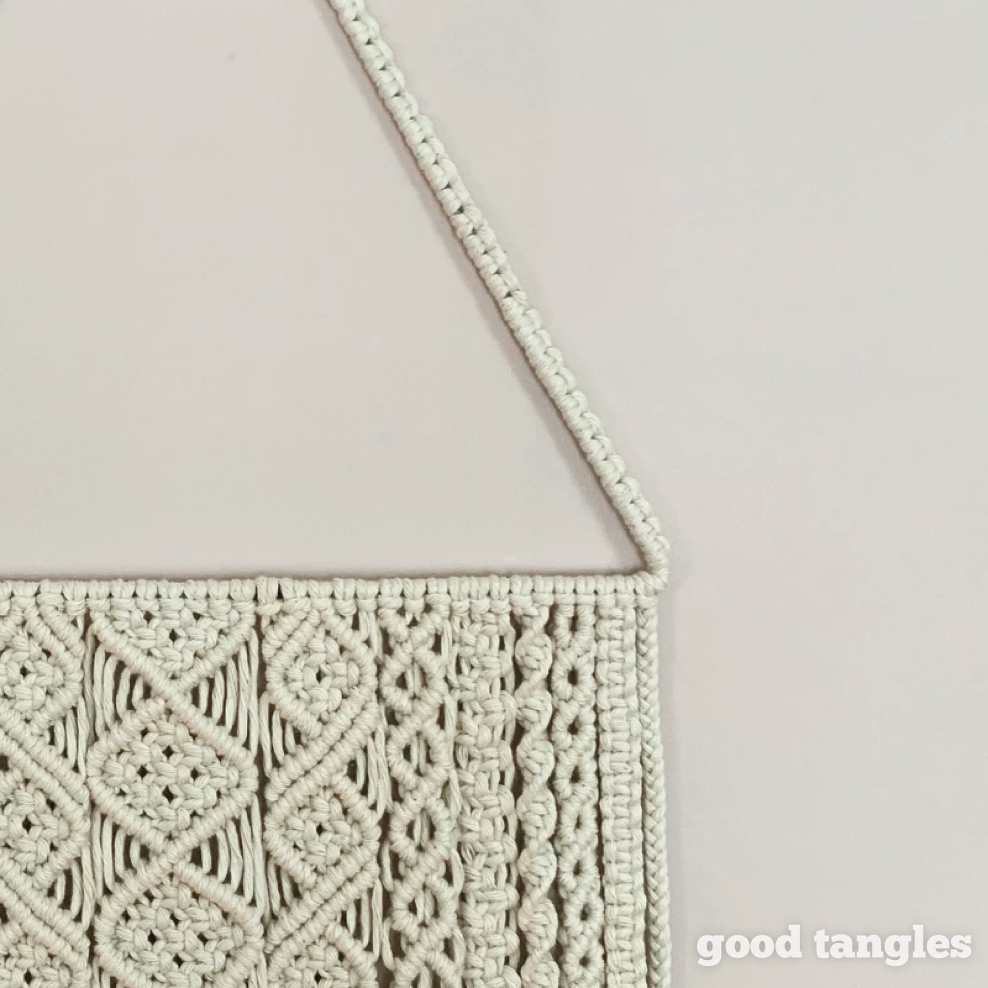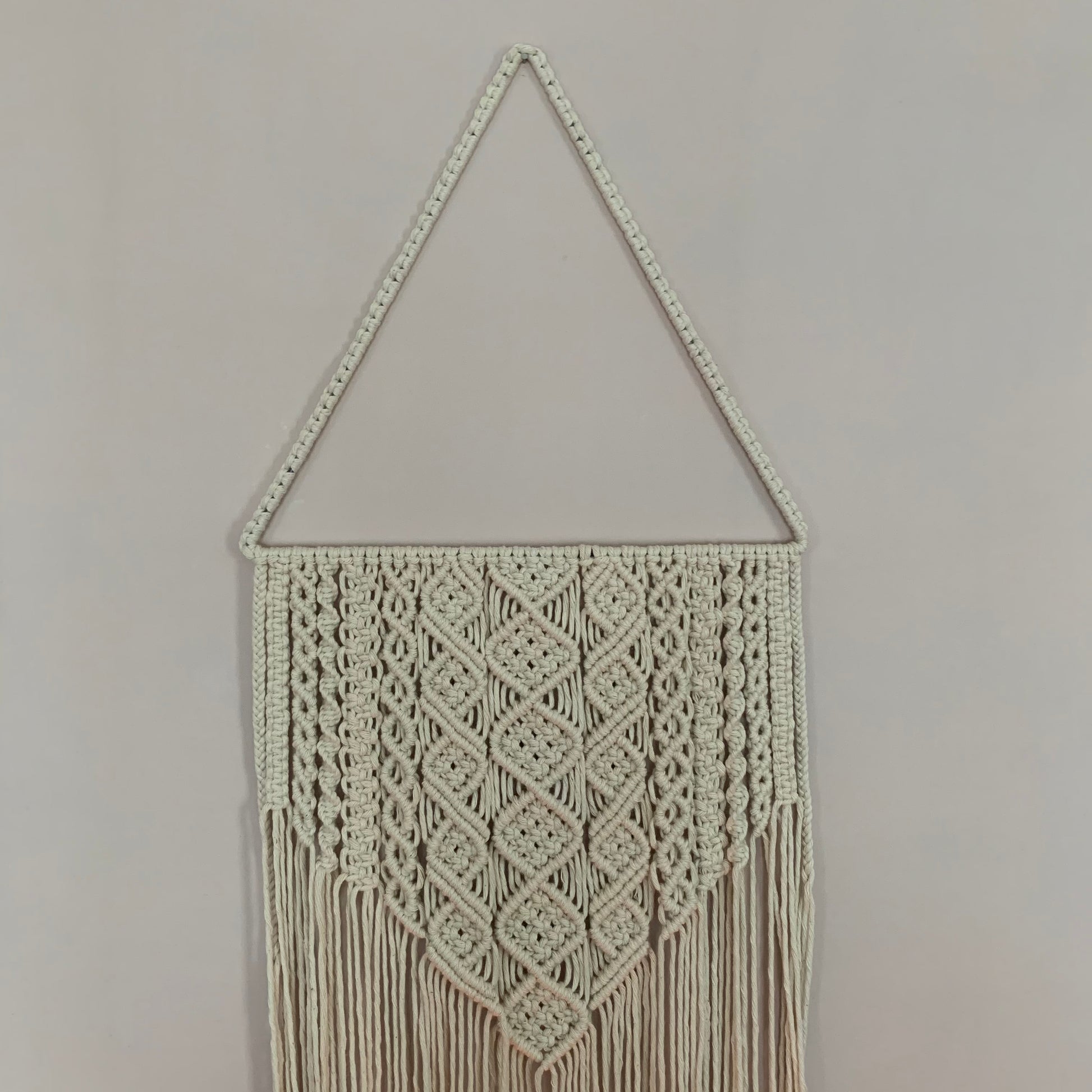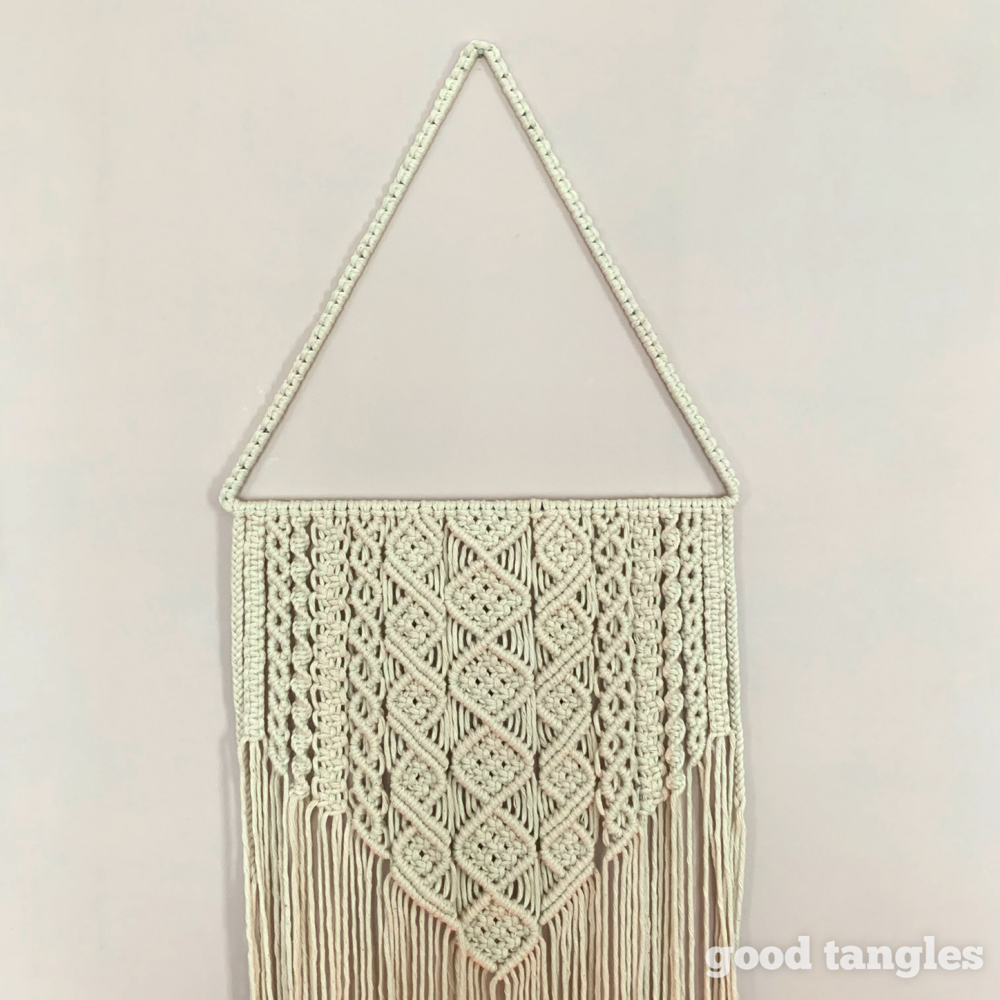 Triangular woven frame with a triangular knotted pattern. Very pleasing to the eye... calming. A beautiful piece!
